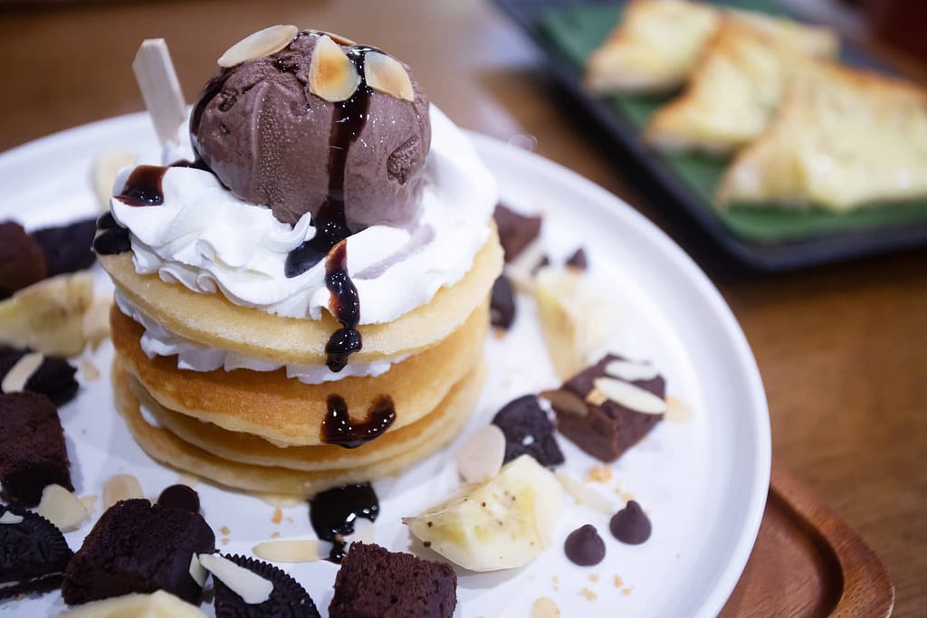 This is an irresistible hybrid of a breakfast and a dessert. By putting ice cream directly on top of the pancake, it will start to melt and spread to all sides of the pancake. Then, you can add chocolate or caramel syrup to make a visual statement. It tastes great!