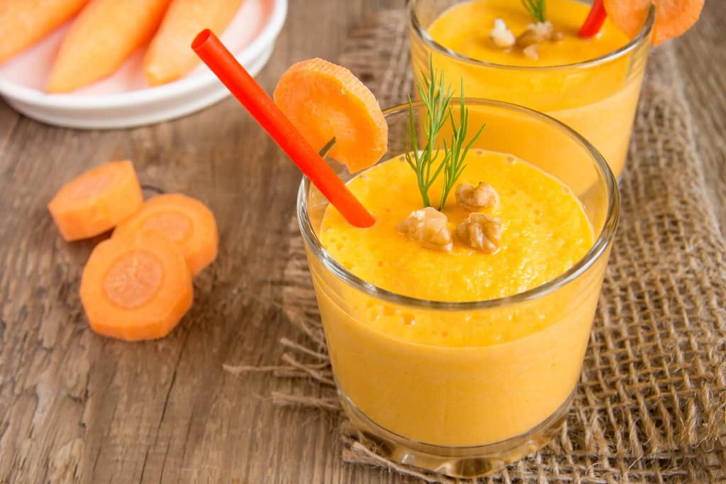 Carrots are some of the most hydrating fruits along with banana and strawberry. When you put carrots with mangoes in a blender, it may come out more like a juice rather than a smoothie, so I recommend adding either Greek yogurt, avocado, or oats to make your smoothie thicker. Cinnamon and banana are great mix-ins as well.